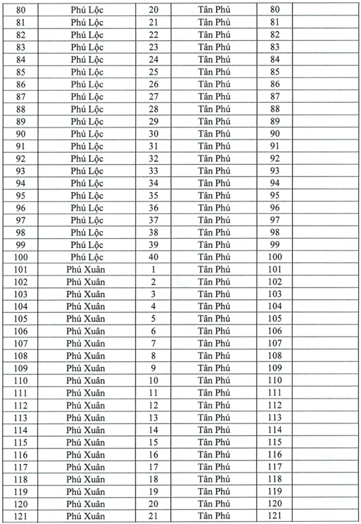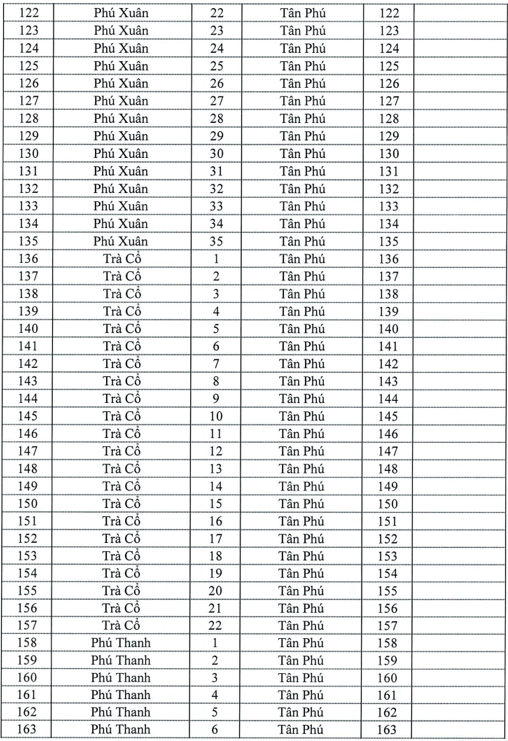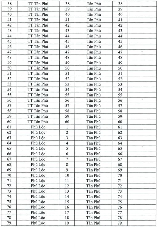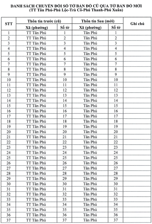 Sau sắp xếp, các xã Trà Cổ, Phú Lộc, Phú Thanh, Phú Xuân và thị trấn Tân Phú thuộc huyện Tân Phú (cũ) có thay đổi địa giới hành chính thành xã Tân Phú (mới). Theo đó, số tờ bản dồ, bản đồ địa chính của các xã Trà Cổ, Phú Lộc, Phú Thanh, Phú Xuân cũ được thay đổi đánh lại số tờ bản đồ địa chính mới như sau:
